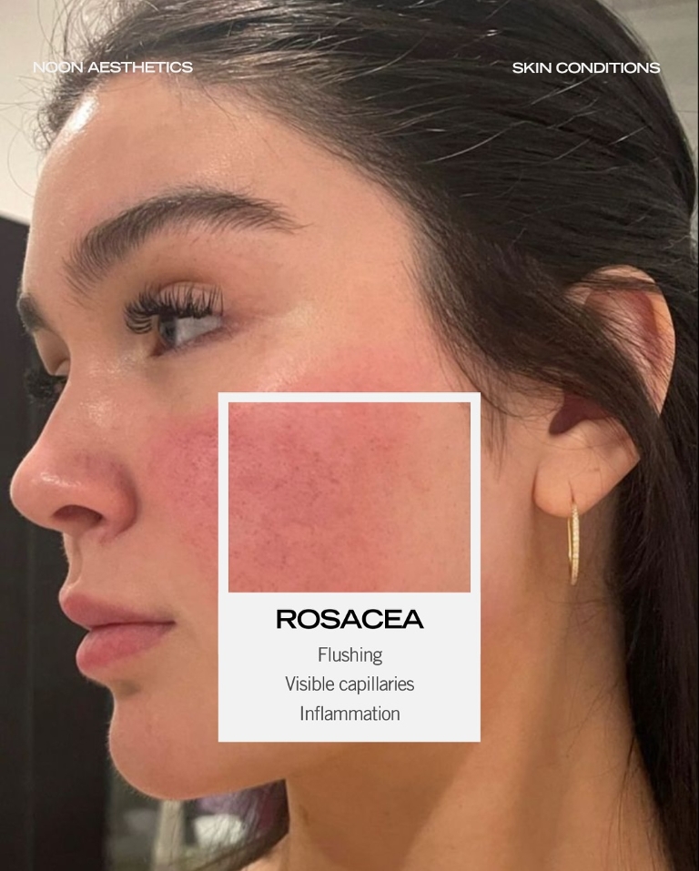 Bij Rosacea zien we veel Erytheem (roodheid) op de wangen, kin of neus met teleangiëctasieën, en/of couperose, papulopustels, furunkels en cysten.